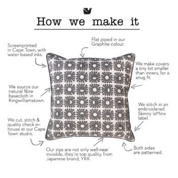 Designed by Heather Moore, screenprinted by our print partners at Imaterial, and stitched by our in-studio seamstress team, all right here in Cape Town.