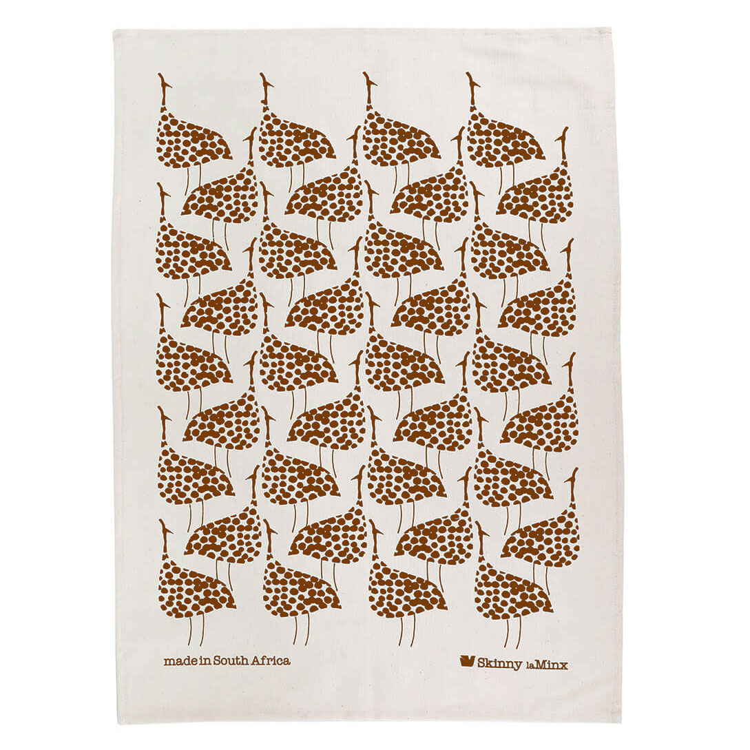 The Guineafowl Tea Towel design was developed from a linocut print by Heather Moore. Look out for these dotty birds by the roadside all across South Africa.